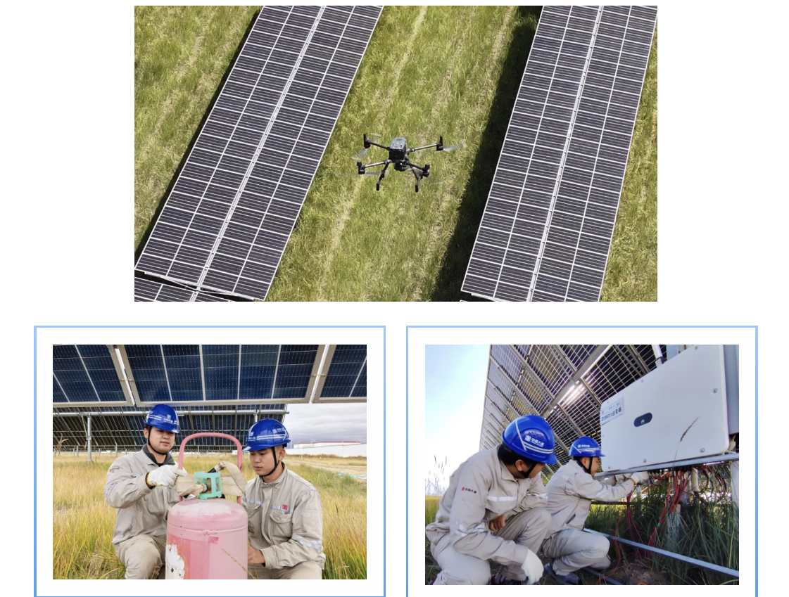 光伏矩阵中,无人机开展精细“体检”,巡检人员身影穿梭其中,共同守护光能的高效转化,点亮绿色发展的无限“光”景。