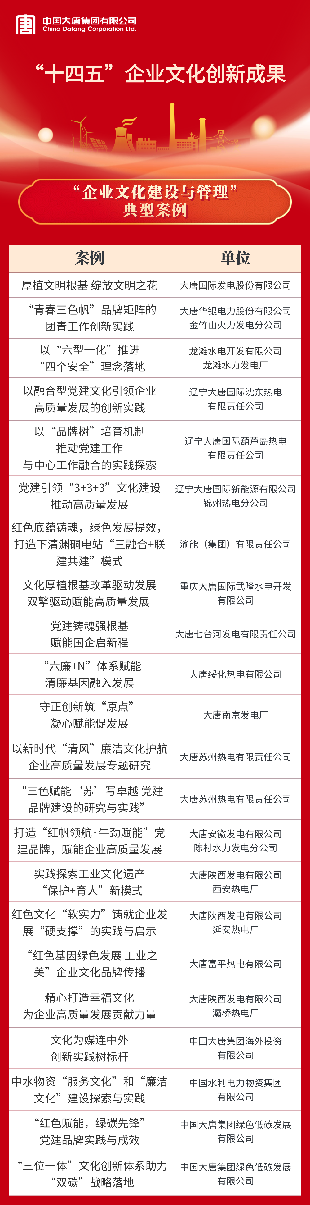 大唐国际发电股份有限公司等22家单位获评“十四五”企业文化建设与管理典型案例;中国大唐及所属8家单位获评“十四五”企业文化建设与管理典型经验;中国大唐及所属5家单位获评课题研究成果一等;大唐国际发电股份有限公司张家口发电分公司等6家单位获评课题研究成果二等。具体名单如下: