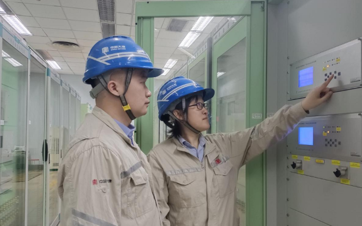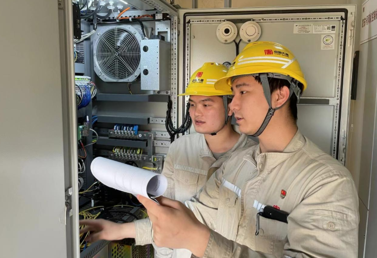 封月坤(右一)和赵光辉(左一)师徒二人正在查看设备。王蝶 摄