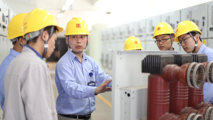 王江辉现场为青年职工讲解断路器工作原理。皮永青 摄