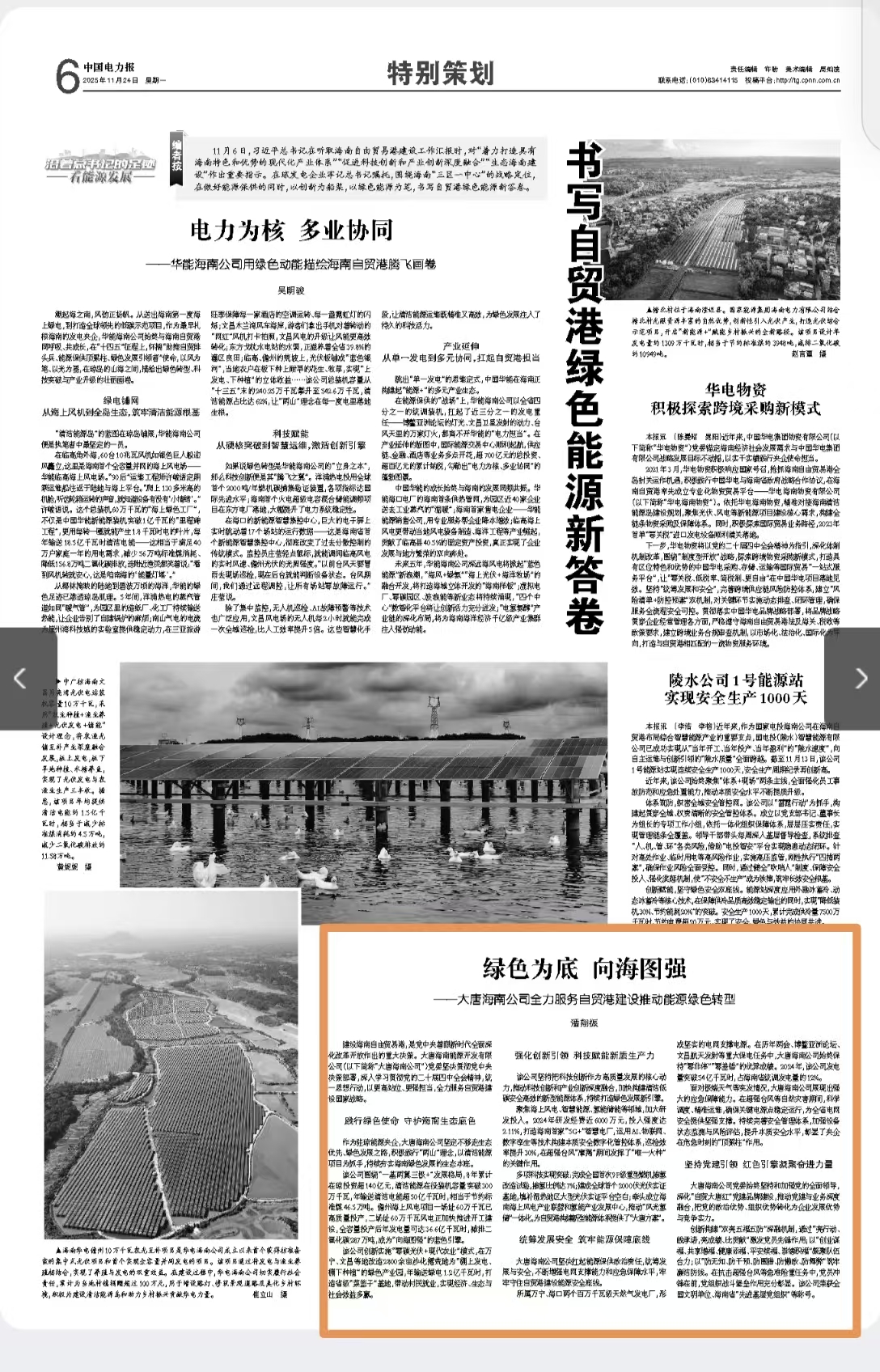 [中国电力报]2025-11-24 绿色为底 向海图强  ——大唐海南公司全力服务自贸港建设推动能源绿色转型