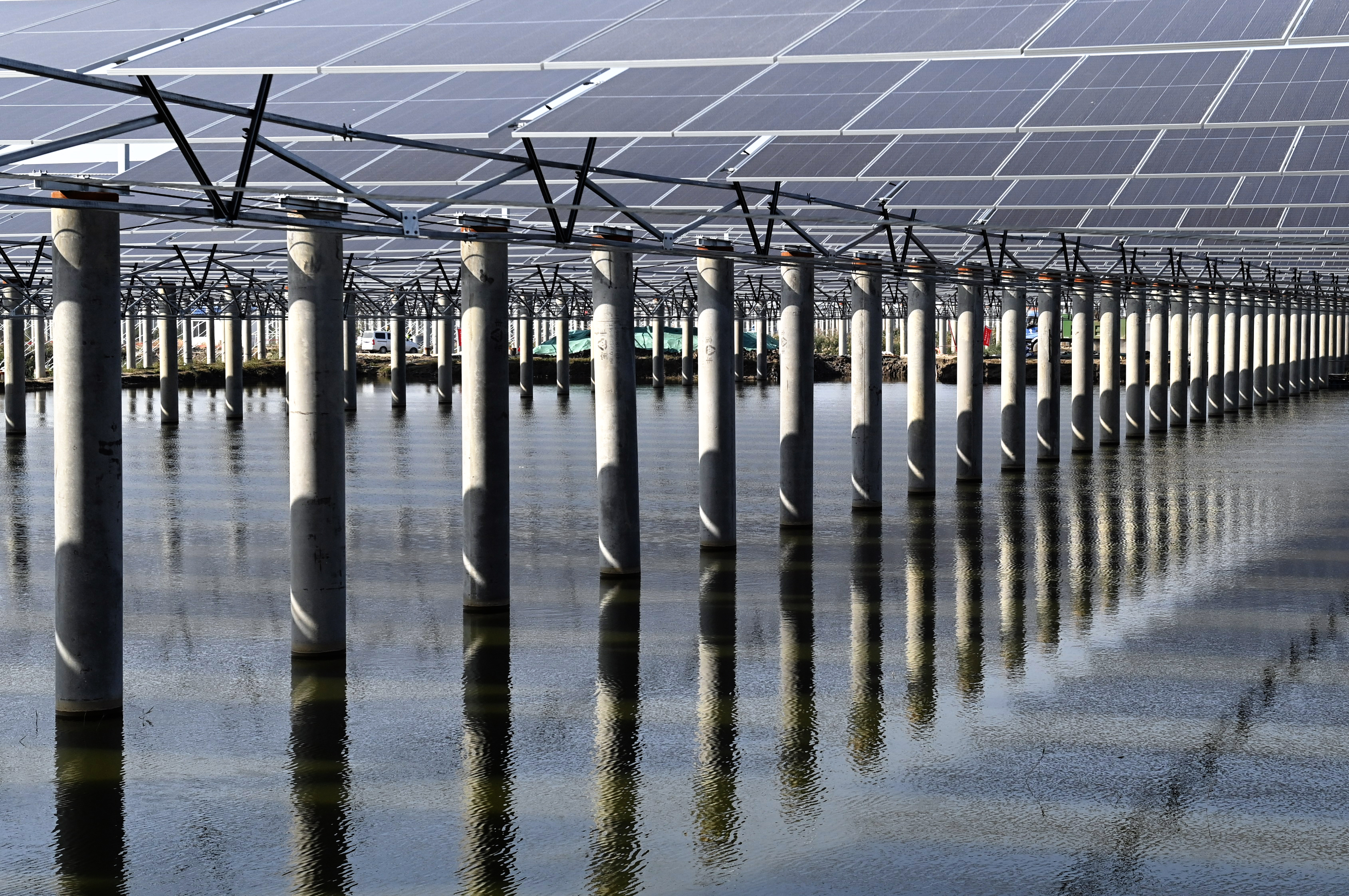 浮船巡游水面,车辆穿行阡陌,机械轰鸣,人行匆匆。25000余根直径600毫米、整高14米的管桩伫立于波光潋滟的水塘,一眼无边。部分方阵已架设起银光闪耀的光伏板;其余如待发的战士,静待着最后一道“武装”。